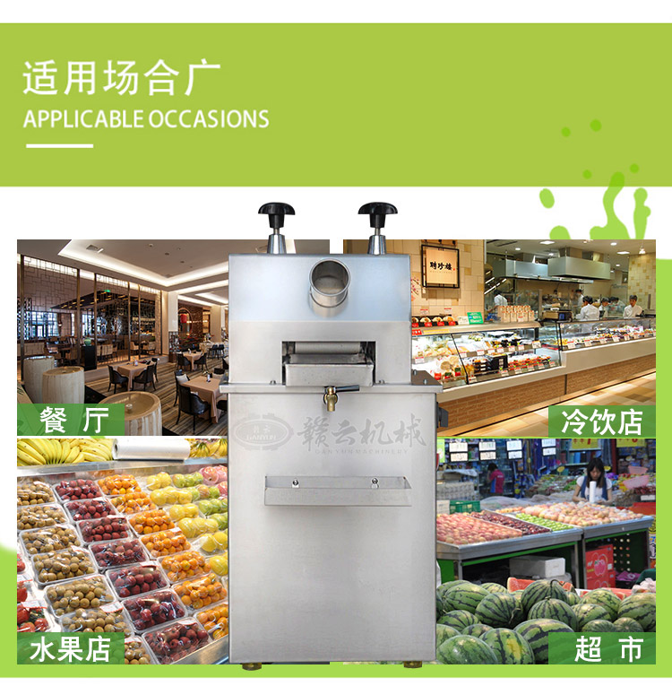 本產(chǎn)品適用于城鄉(xiāng)商場、菜場、商業(yè)街等人流量集中區(qū)。男女老少均可操作,成本低、利潤高,現(xiàn)榨現(xiàn)賣,是發(fā)家致富的好幫手?杉庸じ收帷⑸、蘋果、高粱桿、玉米桿等進行榨汁之用。