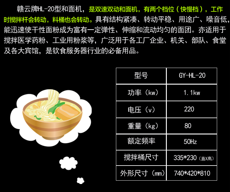 贛云牌HL-20型和面機,立式雙速雙動型和面攪拌機,有兩個檔位(快慢檔),工作時攪拌桿會轉動,料桶也跟隨轉動。具有結構緊湊、轉動平穩(wěn)、用途廣、噪音低,能迅速使干性面粉成為富有一定彈性、伸縮和流動均勻的面團。亦適用于攪拌醫(yī)學藥粉、工業(yè)用粉漿等,廣泛用于各工廠企業(yè)、機關、部隊、食堂及各大賓館,是飲食服務器行業(yè)的常見用品。我廠常規(guī)批量生產(chǎn)供應的雙速雙動和面攪拌機有20L和30L兩種型號,如需更大規(guī)格可定做,如60L、80L,歡迎來電咨詢:電話0797-8373422