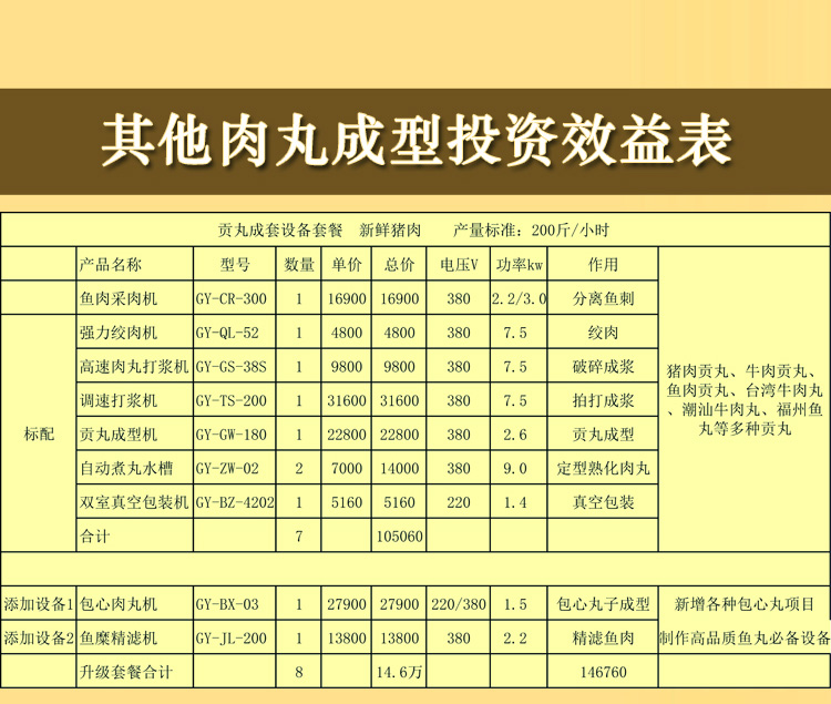 | 貢丸成套設(shè)備套餐 新鮮豬肉 產(chǎn)量標(biāo)準(zhǔn):200斤/小時(shí) 所需面積:100平米 |