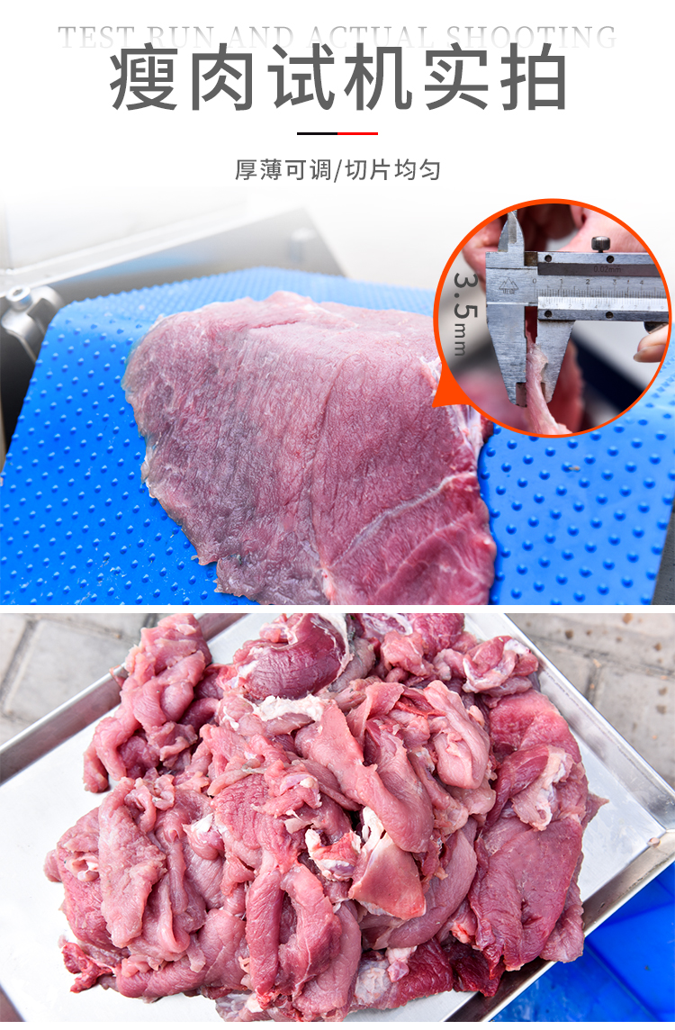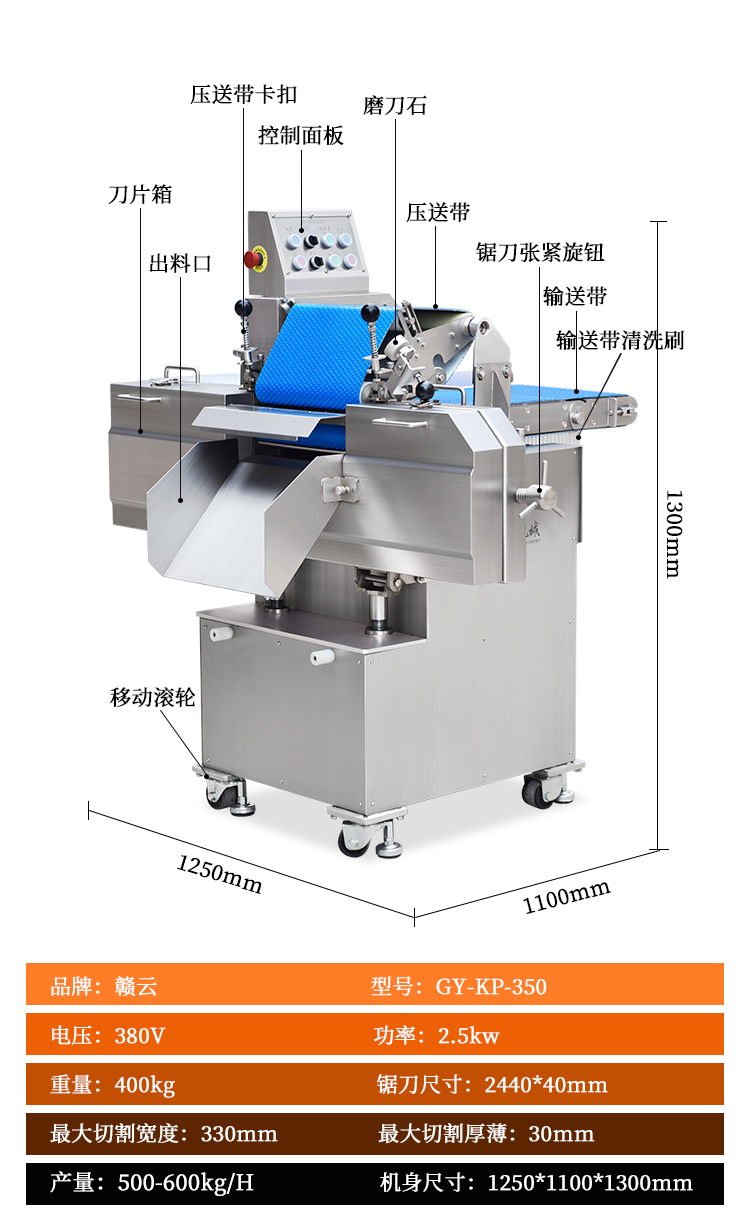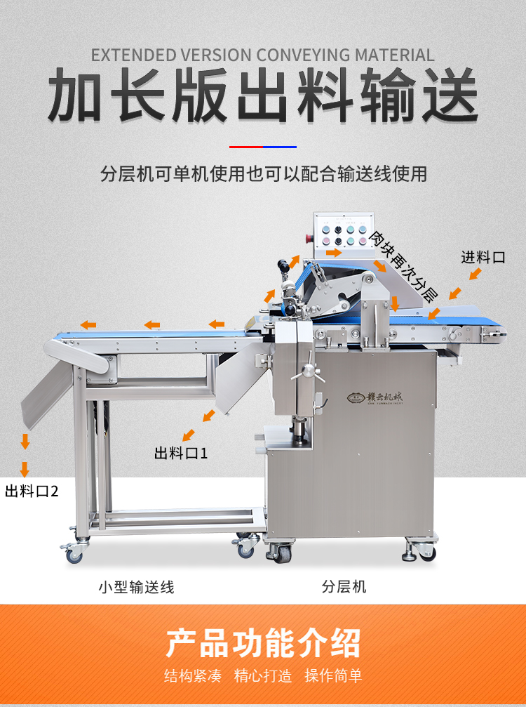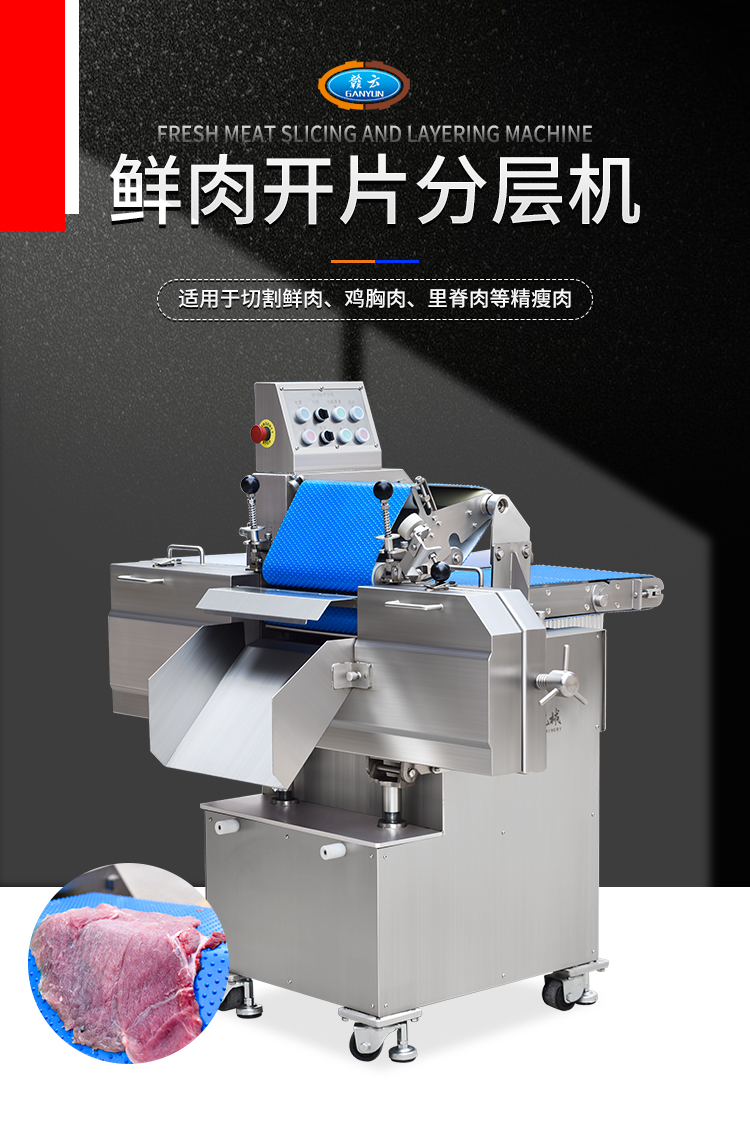贛云350鮮肉開片分層機,全自動分層機,適用于切割鮮肉、雞胸肉、里脊肉、瘦肉等肉制品加工切片的設(shè)備,切肉片機器使用不銹鋼材質(zhì),環(huán)形切刀,厚薄可調(diào),切肉機分層機增加了小型輸送線,多功能切肉片機器適用于肉制品加工廠,中央廚房設(shè)備中。