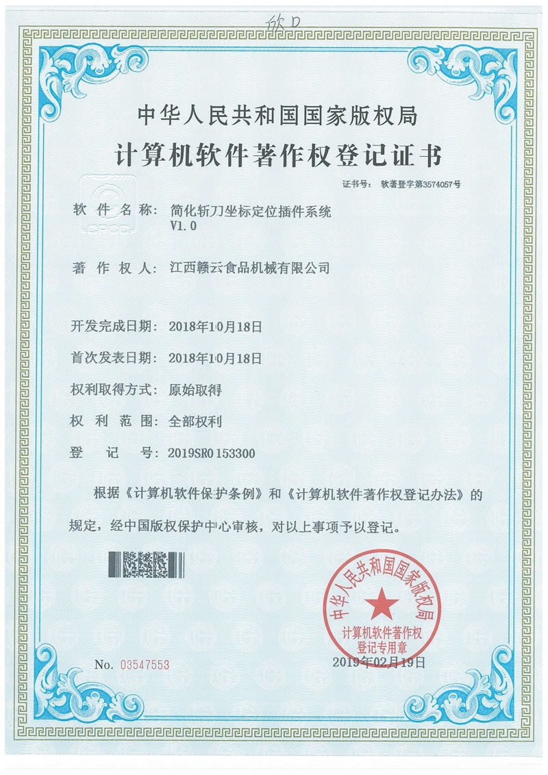 計算機軟件著作權登記證書(簡化斬刀坐標定位插件系統(tǒng))