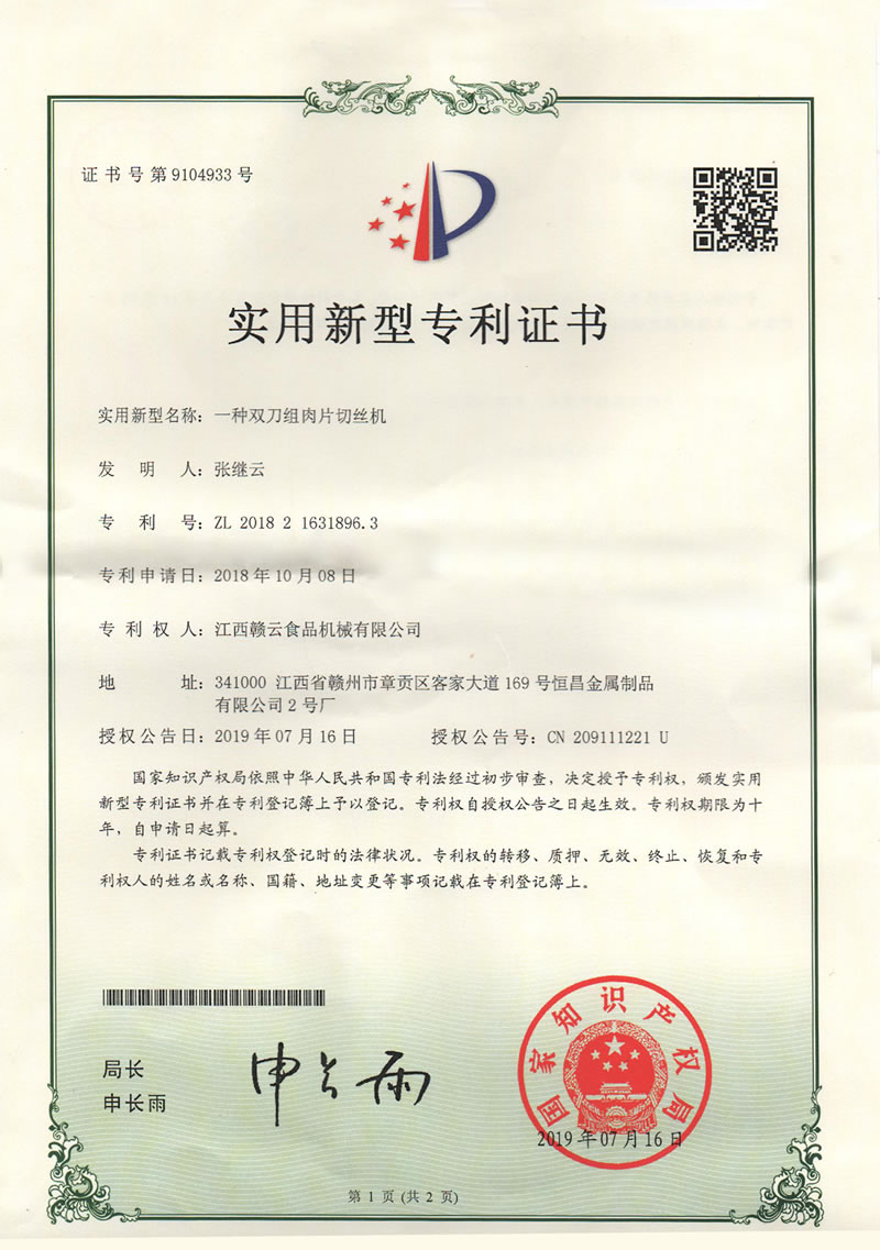 實用新型專利證書(雙刀組肉片切絲機)