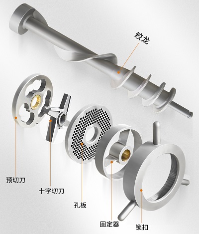 設(shè)備使用后的清洗工作也很簡(jiǎn)單:先將出料口的鎖口松開(kāi),然后取下十字刀、孔板、預(yù)切刀、絞龍等配件放入清水池中清洗,使用熱水效果更佳。然后,用清水將入料口和出料口進(jìn)行沖水清洗,將所有散落的肉渣沖洗干凈。
