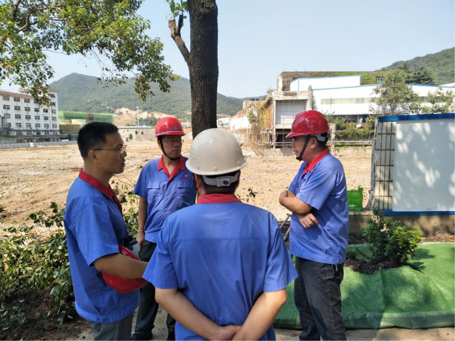 高申保在PVB膠片項(xiàng)目施工現(xiàn)場(chǎng)檢查蒸汽管線水泥支柱拆除、基礎(chǔ)混凝土澆筑等工作開(kāi)展情況,與項(xiàng)目經(jīng)理沈小罡、施工單位負(fù)責(zé)人交流。