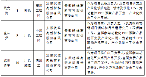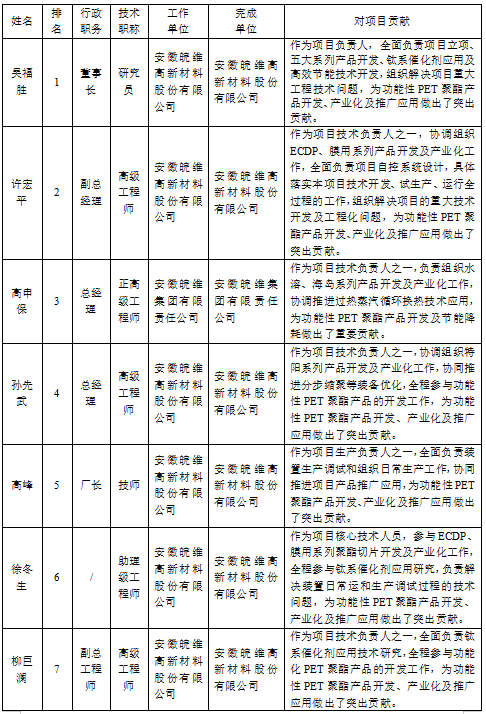 1、項目第完成人吳福勝與第二完成人許宏平、第三完成人高申保、第四完成人孫先武、第五完成人高峰、第七完成人柳巨瀾、第八完成人錢光海、第十完成人歐陽勇軍共同實施“多元改性功能化聚對苯二甲酸乙二醇酯研發(fā)及產業(yè)化”項目實施,合作方式為共同立項。
