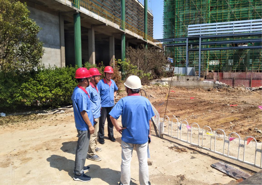 高申保在PVB膠片項(xiàng)目施工現(xiàn)場(chǎng)檢查蒸汽管線水泥支柱拆除、基礎(chǔ)混凝土澆筑等工作開(kāi)展情況,與項(xiàng)目經(jīng)理沈小罡、施工單位負(fù)責(zé)人交流。